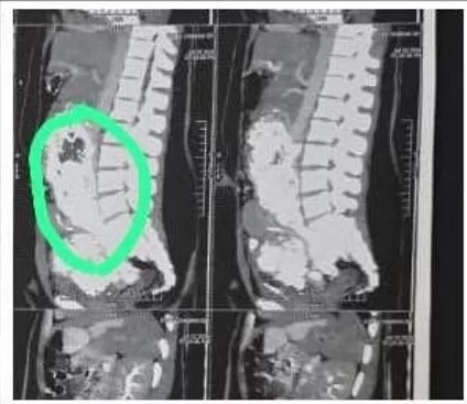 كما امتد الورم ليصل إلى الوريد الحرقفي الأيمن وحتى الوريد الأجوف السفلي، مما تسبب في انسداد تام بالأوردة الرئيسية.