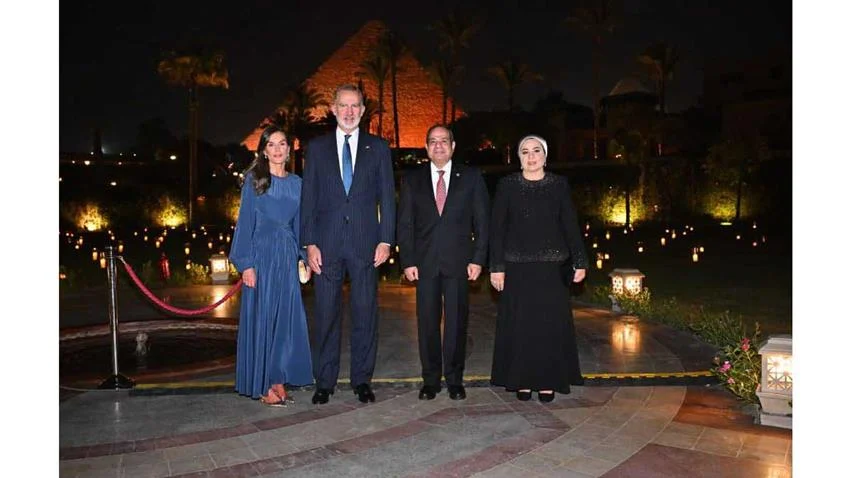 أضاف المتحدث الرسمي أن السيد الرئيس والسيدة قرينته اصطحبا ملك وملكة إسبانيا، عقب مأدبة العشاء، في جولة بمنطقة أهرامات الجيزة وأبو الهول، حيث التُقطت صور تذكارية توثّق هذه اللحظة، كما استمع الضيفان، برفقة السيد الرئيس والسيدة قرينته، إلى شرح موجز حول تاريخ أبو الهول وما يرمز إليه من إرث حضاري خالد.
