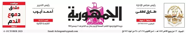 <!-- wp:heading {"level":3} --> <h3 class="wp-block-heading"><strong>تصفــح عـدد جـريدة الجمـهـورية ليوم السبت 4 أكتوبر 2025 عـبر <a href="http://algomhuria.gomhuriaonline.com/wp-content/uploads/2025/10/0410.pdf" target="_blank" rel="noreferrer noopener">الـرابط</a>:</strong></h3> <!-- /wp:heading --> <!-- wp:image {"lightbox":{"enabled":false},"id":168030,"width":"829px","height":"auto","sizeSlug":"large","linkDestination":"custom","align":"center"} --> <figure class="wp-block-image aligncenter size-large is-resized"><a href="http://algomhuria.gomhuriaonline.com/wp-content/uploads/2025/10/0410.pdf" target="_blank" rel=" noreferrer noopener"><img src="http://algomhuria.gomhuriaonline.com/wp-content/uploads/2025/10/0410-667x1024.webp" alt="" class="wp-image-168030" style="width:829px;height:auto"/></a></figure> <!-- /wp:image -->