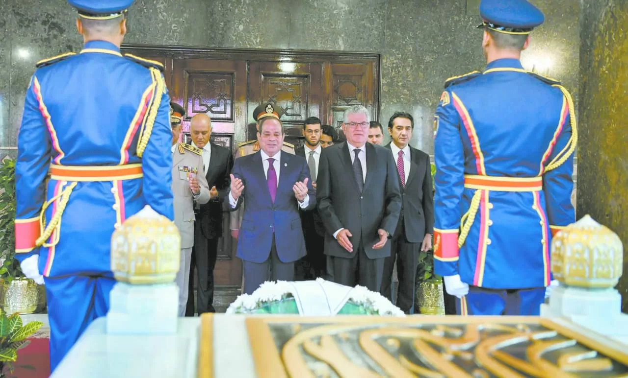 السيسى يضع إكليلاً من الزهور على قبر الجندى المجهول وقبرى السادات وعبدالناصر