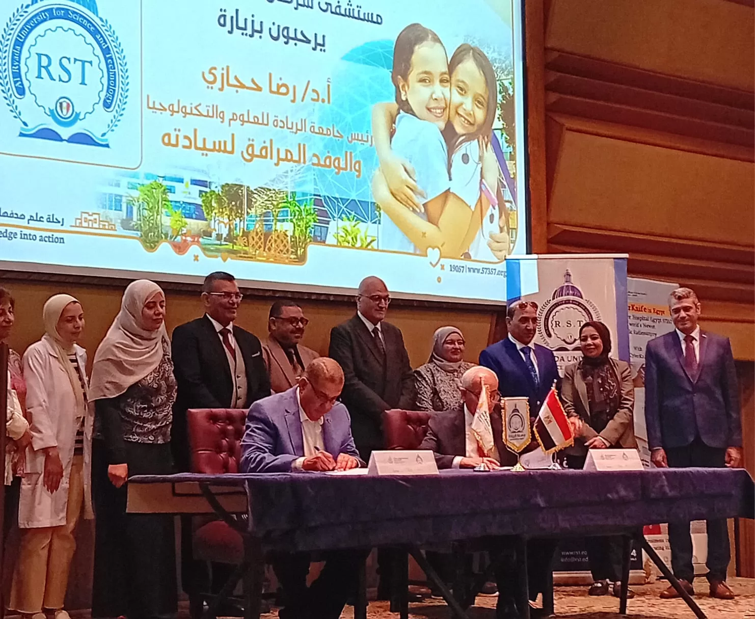 وقّع البروتوكول كل من الأستاذ الدكتور رضا حجازي، رئيس جامعة الريادة للعلوم والتكنولوجيا، والدكتور شريف أبو النجا، مدير مستشفى 57357.
