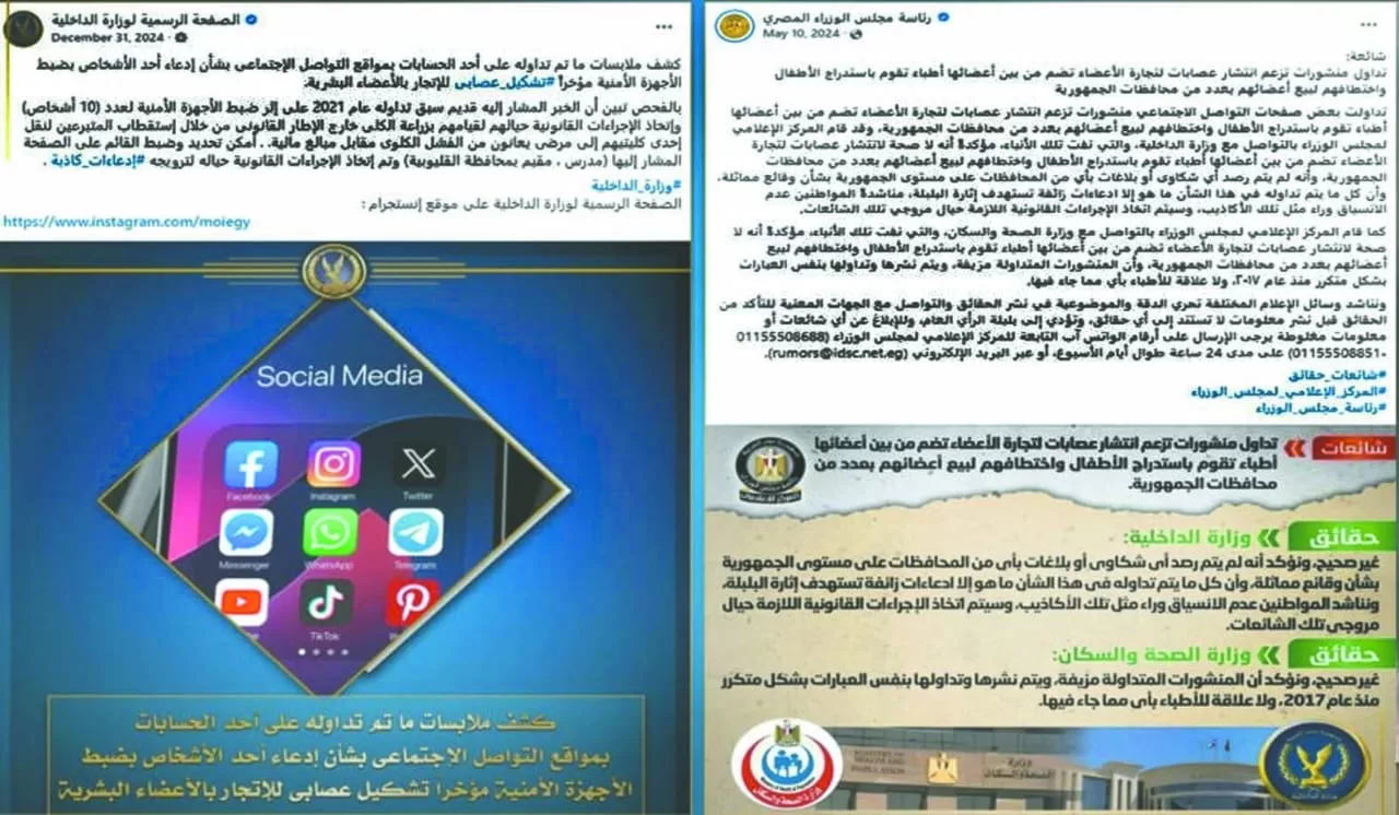 ذكرت الوزارة فى بيان لها إنه بالنسبة لما تم تداوله على إحدى الصفحات بمواقع التواصل الاجتماعى بشأن ضبط تشكيل عصابى يضم عدداً من أطباء الجراحة والتخدير تخصص نشاطهم الإجرامي فى الإتجار بالأعضاء البشرية، وبحوزتهم «75» طفلا بمحافظة الغربية فإنه بالفحص تبين سابقة تداول تلك الإدعاءات أكثر من مرة خلال الأعوام السابقة وتم نفيها من خلال الجهات الرسمية بالدولة.