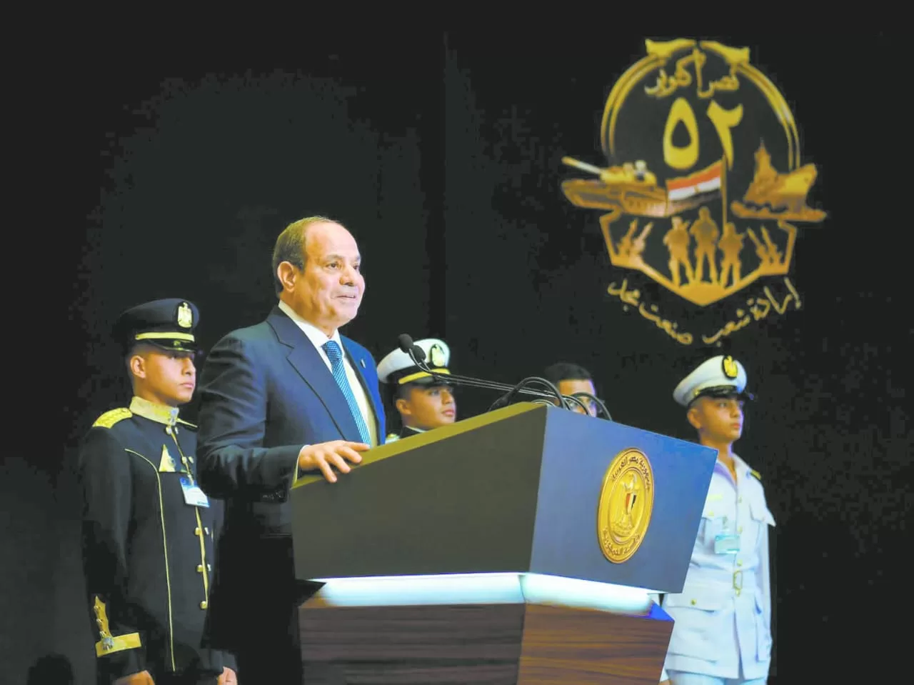 أكد أن أبناء القوات المسلحة من ضباط وضباط صف ومجندين قاتلوا بشجاعة لرفع راية مصر خفاقة بين الأمم، موضحا أن الحرب ليست فقط مواجهة بالسلاح، بل لها صور متعددة، مشيرا إلى أن ما تشهده مصر اليوم هو شكل آخر من أشكال الحرب يتمثل فى الانتصار على الظروف الصعبة، وتغيير الواقع إلى الأفضل، وبناء مستقبل مشرق للأجيال القادمة.