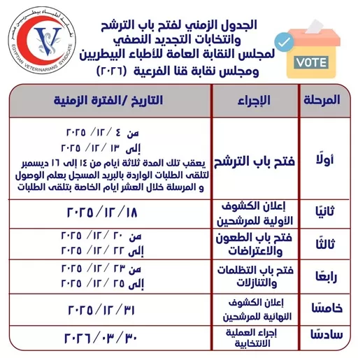 أعلنت النقابة العامة للأطباء البيطريين، برئاسة الدكتور مجدي حسن النقيب العام، عن فتح باب الترشح لانتخابات التجديد النصفي لمجلس النقابة العامة للأطباء البيطريين، ومجلس نقابة الأطباء البيطريين الفرعية بمحافظة قنا لعام 2026.