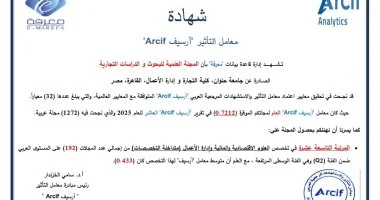 مجلة «تجارة حلوان».. أفضل المجلات العربية في تصنيف معامل التأثير والاستشهادات المرجعية العربي (ARCIF) لعام 2025