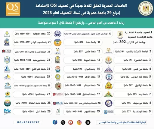 حققت جامعة حلوان إنجازًا عالميًا جديدًا، حيث احتلت المركز 857 عالميًا في تصنيف QS Sustainability 2026، محققة المركز الثاني عشر محليًا، ومتقدمة 381 مركزًا عالميًا عن العام الماضي و5 مراكز محلية، وذلك بين 29 جامعة مصرية يشملها التصنيف.
