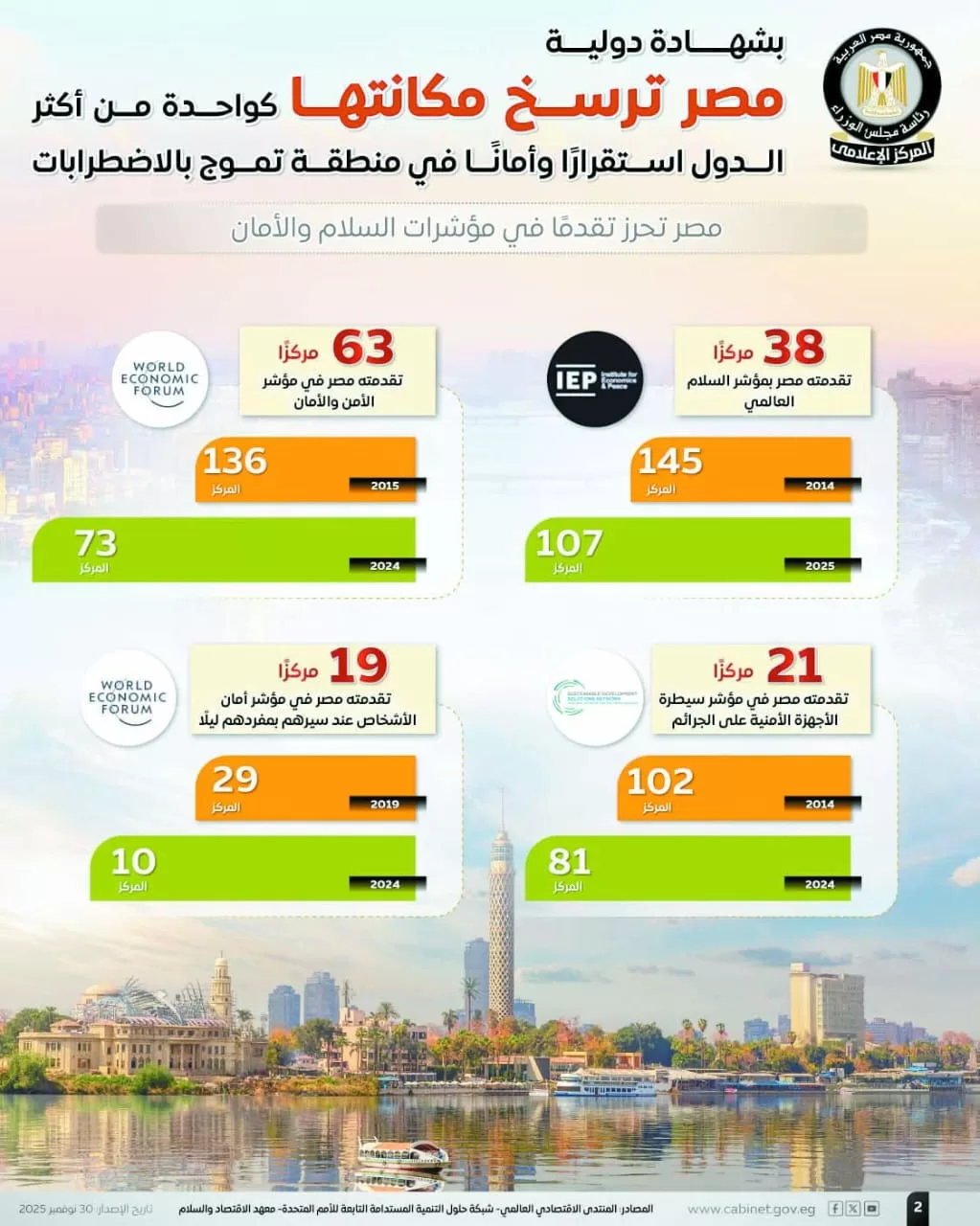 وأشار تقرير للمركز الإعلامى لمجلس الوزراء إلى إحراز مصر تقدمًا فى مؤشرات السلام والأمان، إذ تقدمت 38 مركزًا بمؤشر السلام العالمى الصادر عن معهد الاقتصاد والسلام، لتحتل المركز 107 عام 2025، مقابل المركز 145 عام 2014، كما تقدمت 63 مركزًا فى مؤشر الأمن والأمان الصادر عن المنتدى الاقتصادى العالمي، لتصل إلى المركز 73 عام 2024، مقابل المركز 136 عام 2015.