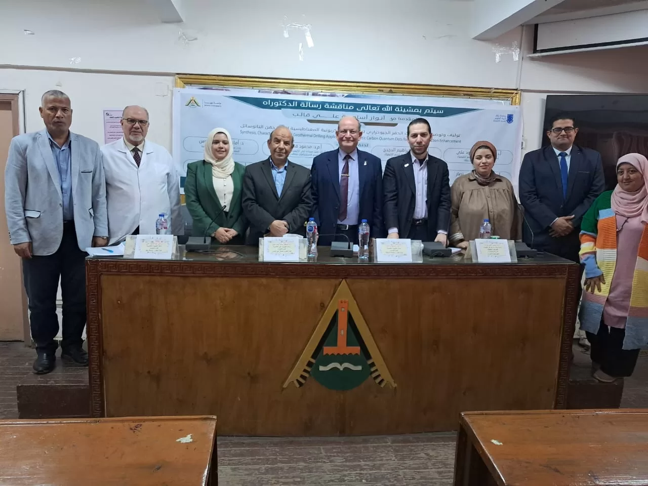 خالص التهاني وأطيب الأمنيات للباحثة أنوار أسامة بمناسبة حصولها على درجة الدكتوراه في الفلسفة في الكيمياء العضوية، وذلك عن رسالتها العلمية الموسومة بعنوان: «توليف وتوصيف وتطبيقات الحفر الجيوحراري لنقاط الكم الكربونية المغناطيسية لتعزيز حقن النانوسوائل».