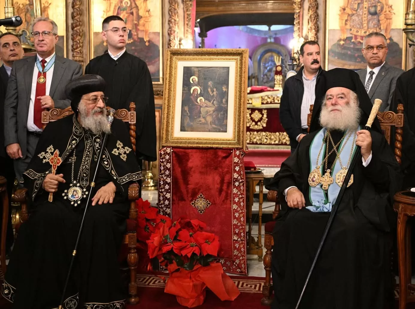 رافق البابا خلال زيارة التهنئة الأنبا دانيال مطران المعادي، والأنبا يوليوس الأسقف العام لمصر القديمة وأسقفية الخدمات والأنبا أنجيلوس الأسقف العام لكنائس قطاع شبرا الشمالية والأنبا ماركوس أسقف دمياط وكفر الشيخ والبراري، والسكرتير المساعد للمجمع المقدس، والراهب القس عمانوئيل المحرقي مدير مكتب البابا، والقمص موسى إبراهيم المتحدث الرسمي باسم الكنيسة، والدكتور جرجس صالح الأمين العام الفخري لمجلس كنائس الشرق الأوسط، والشماس چوزيف رضا من سكرتاريه البابا.