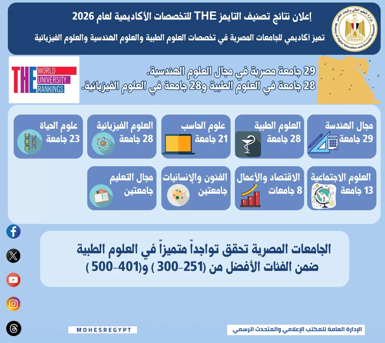 التعليم العالي: إعلان نتائج تصنيف التايمز THE للتخصصات الأكاديمية لعام 2026