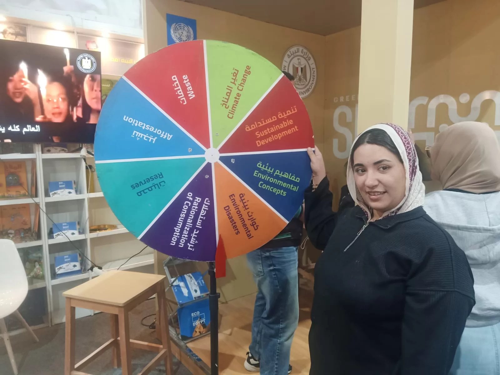- ركن الألعاب البيئية: ويشمل “العجلة الدوارة”، و”سلم وثعبان بيئي”، و”كوتشينة البيئة”، لتبسيط مفاهيم ترشيد الاستهلاك وفصل المخلفات من المنبع.
