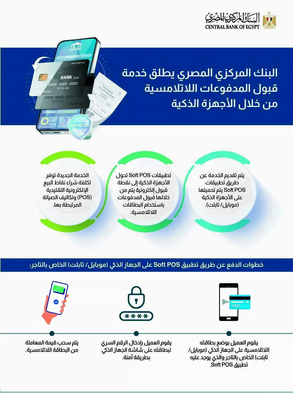 تتيح الخدمة إمكانية تحويل الأجهزة الذكية إلى نقطة قبول إلكترونية يتم من خلالها قبول المدفوعات باستخدام البطاقات «اللاتلامسية» بصورها المختلفة، حيث يقوم التاجر بتحميل تطبيق إلكتروني Soft POS على جهازه الذكي ويتم إدخال الرقم السري للبطاقات مباشرة على شاشة الجهاز الذكي بطريقة آمنة ومعتمدة دوليًا.