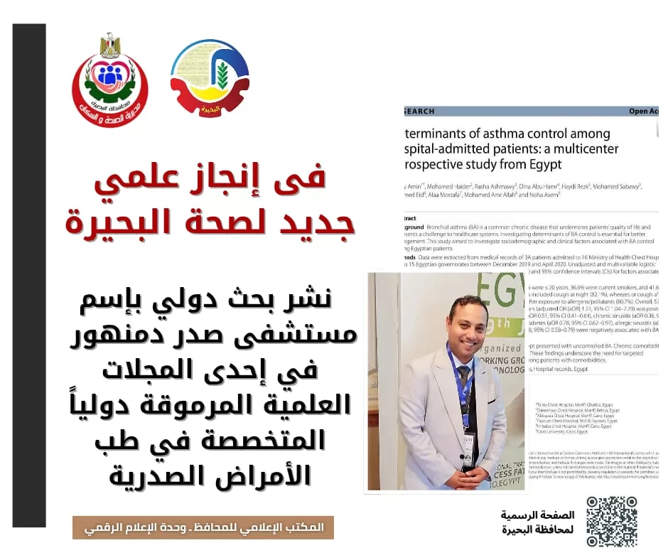 في خطوة تعكس تطور المنظومة الصحية بمحافظة البحيرة، وتجسد الاهتمام المتنامي بالبحث العلمي كركيزة أساسية للارتقاء بالخدمات الطبية؛ نجح مستشفى صدر دمنهور في تحقيق إنجاز علمي دولي جديد بنشر بحث علمي مُحكم بإحدى المجلات العالمية المرموقة المتخصصة في طب الأمراض الصدرية.