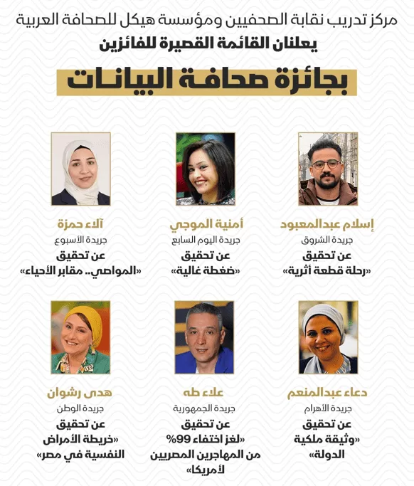في الذكرى العاشرة لرحيل الأستاذ محمد حسنين هيكل، أعلن مركز تدريب نقابة الصحفيين ومؤسسة هيكل للصحافة العربية القائمة القصيرة للفائزين بجوائز ورشة «صحافة البيانات»، وذلك عن أفضل المشروعات الصحفية المنتجة ضمن المنحة التدريبية المتقدمة في إنتاج المحتوى المعزز بالبيانات واستخدام تطبيقات الذكاء الاصطناعي.