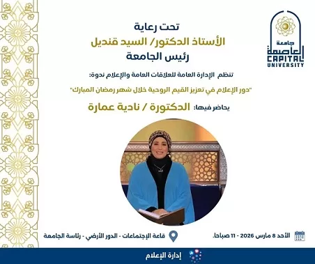 تنظم جامعة العاصمة ندوة بعنوان «دور الإعلام في تعزيز القيم الروحية خلال شهر رمضان المبارك»، وذلك في إطار أنشطتها الثقافية والأكاديمية التي تستهدف دعم الوعي المجتمعي وتعزيز الدور التوعوي للإعلام.